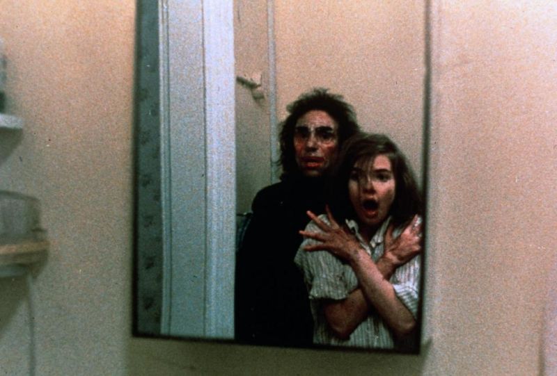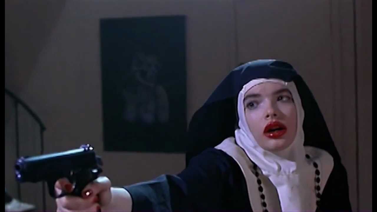 And it’s that naivety in that final scene which makes Thana’s death so significant. Dressed as a “sexy” nun — bright red lipstick and all — Thana is both the embodiment of opposites — murder and sex being forbidden to such figures — and the embodiment of the façade-like nature of the world around her. She also puts on the mask to exact her own sort of justice, one in which men are systematically removed, as if by divine intervention, for the protection of all women, including her friends.[1] The entire moment is captured in slow motion, showing the fear played out over the faces of Thana’s victims in grotesque detail — Thana’s face is almost tense, as if to suggest determination or resolution. And then Thana is stabbed in the back by a coworker/friend: Laurie (Darlene Stuto). For the first time, we hear Thana’s voice, an ethereal scream that surely does not come from Thana’s actual vocal cords, but from beyond the screen. And when she turns to shoot her assailant, we see that shock on Thana’s face: the shock of betrayal.[1]